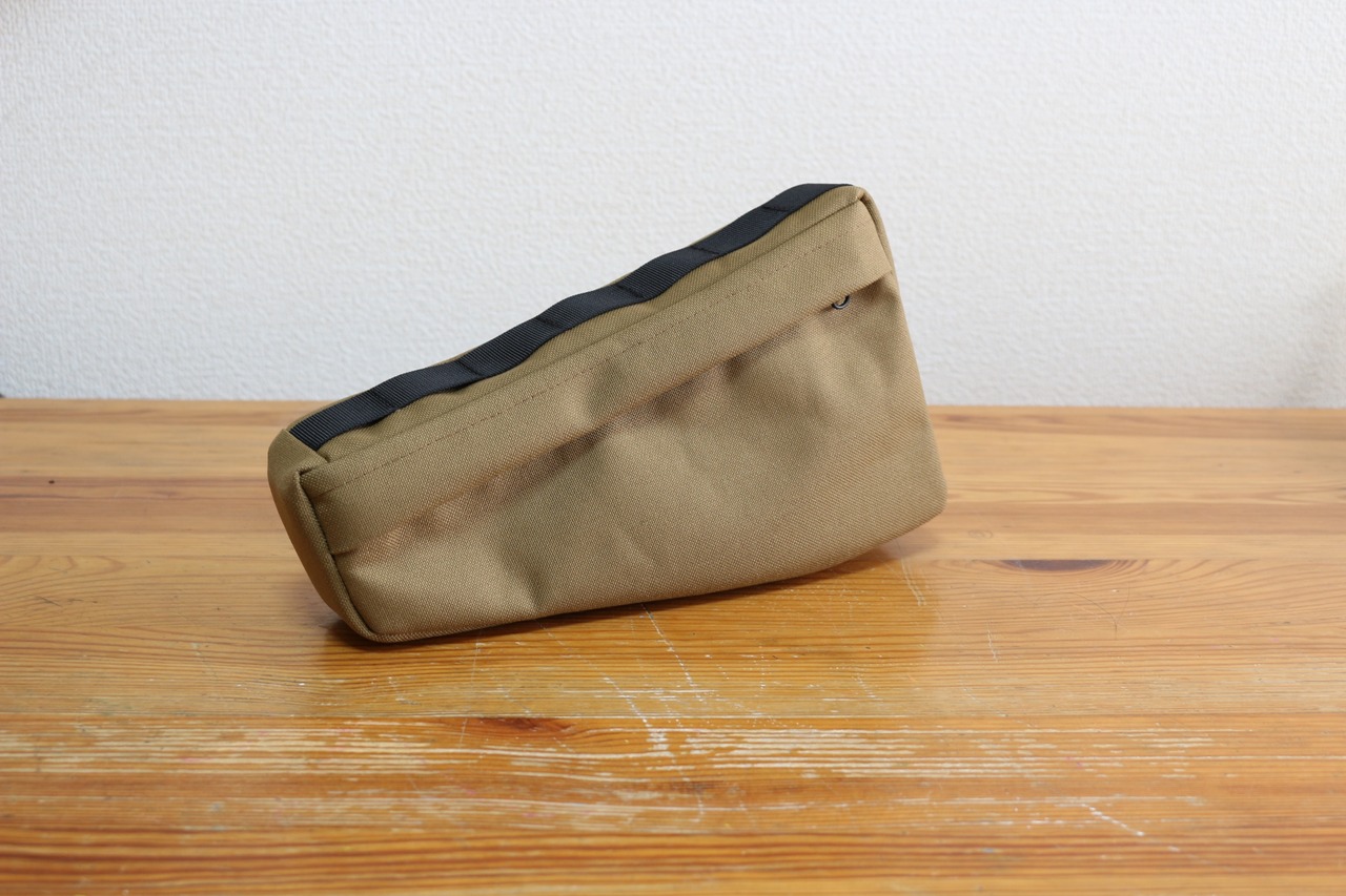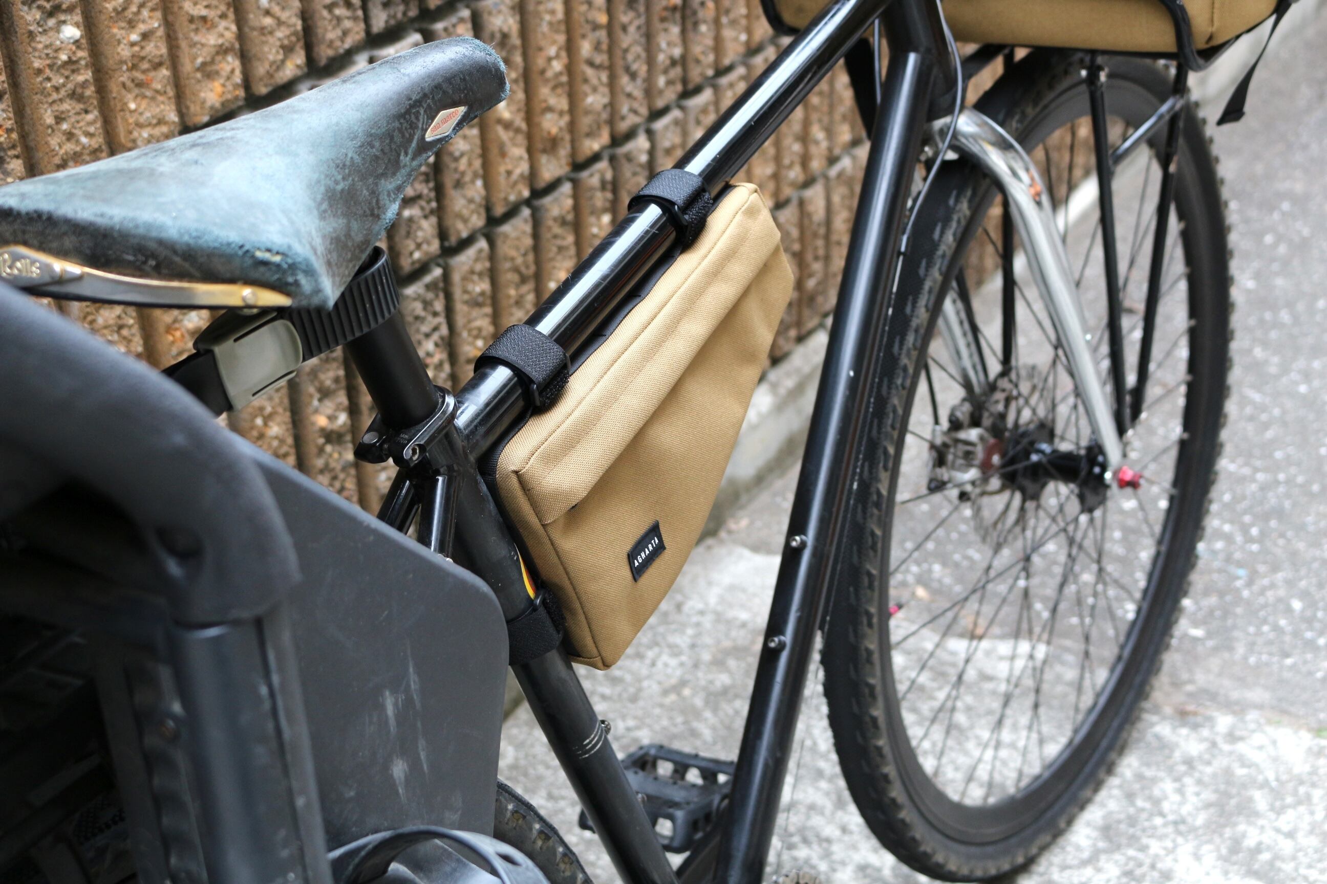 トップチューブとシートチューブの角度が83°くらいのスローピングフレームにバチッとはまるフレームバッグです。