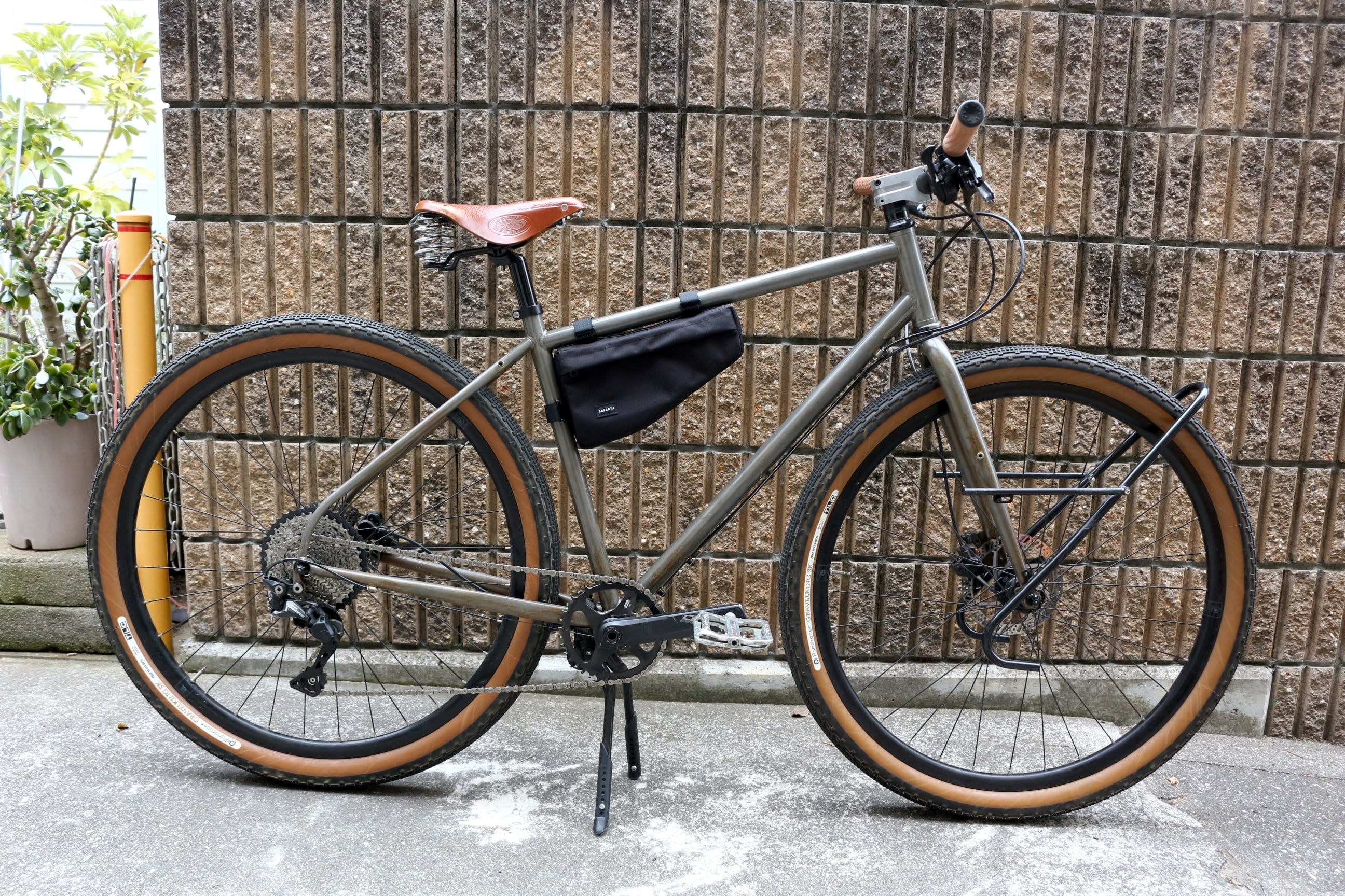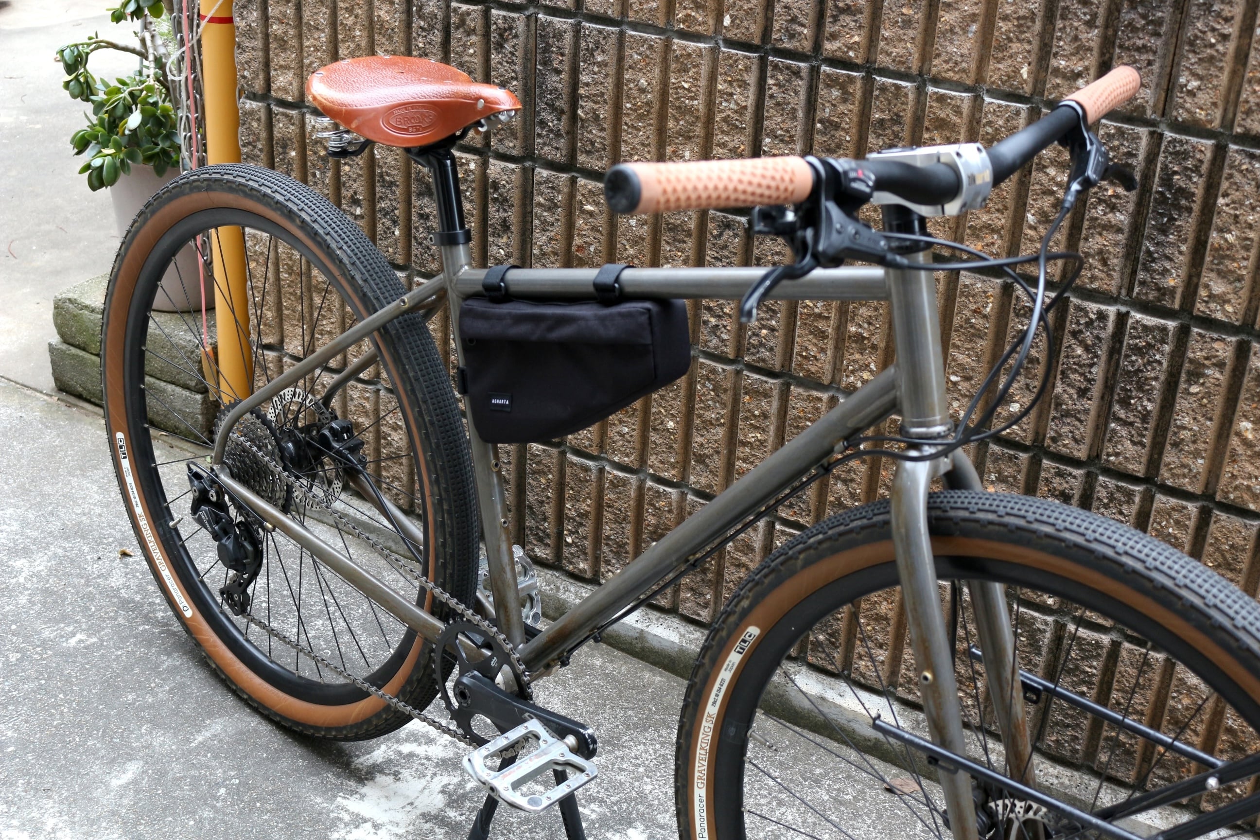 トップチューブとシートチューブの角度が90°くらいのMTBなどにバチッとはまるフレームバッグです。