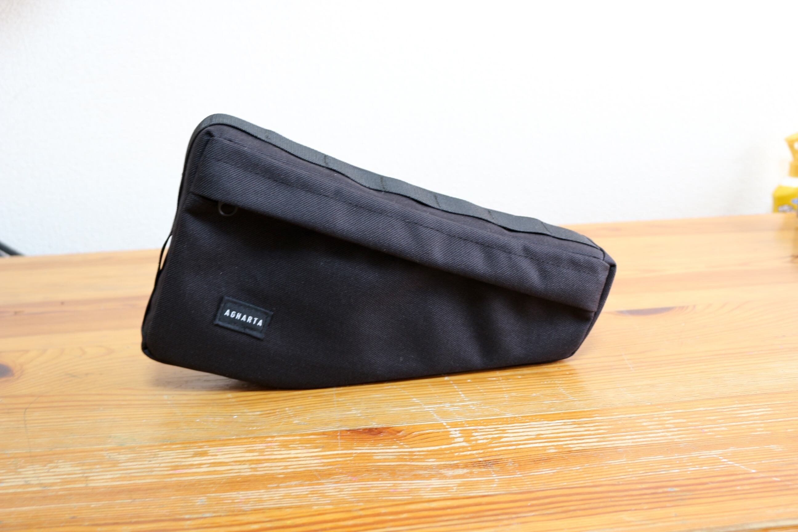 It’s a frame bag designed to fit perfectly on MTBs and similar bikes where the top tube and seat tube meet at about a 90° angle.